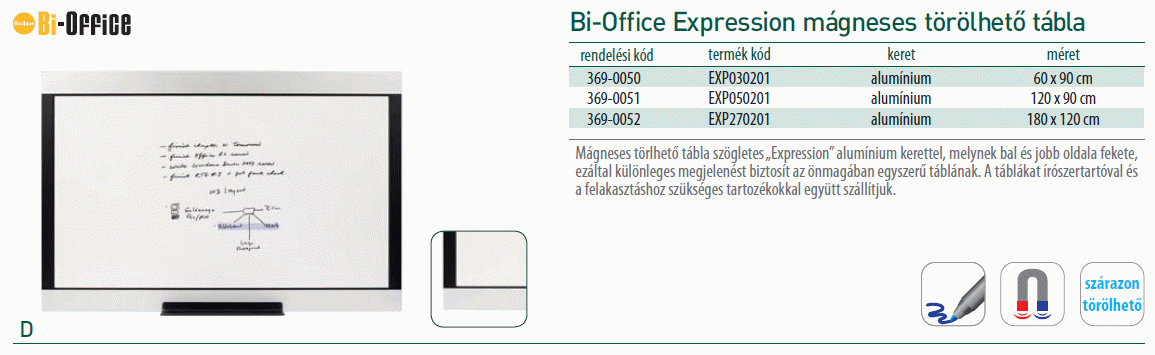 369-0050 | Fehér tábla | Mágneses törölhető fehér tábla alumínium keretes 60x90 Expression EXP030201 Bi-Office | 10 900 Ft | 13 843 Ft | |