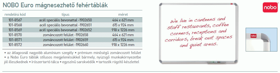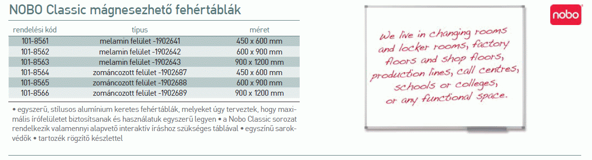 101-8564 | Fehér tábla | Mágneses törölhető fehér tábla alumínium keretes zománcozott felület 45x60cm Nobo Classic | 7 900 Ft | 10 033 Ft | ||