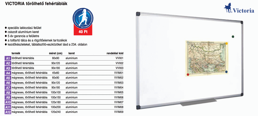 Mágneses törölhető fehér tábla alumínium keretes Victoria /garancia 5 év/ | Akció | Nettó ár | Bruttó ár | |||