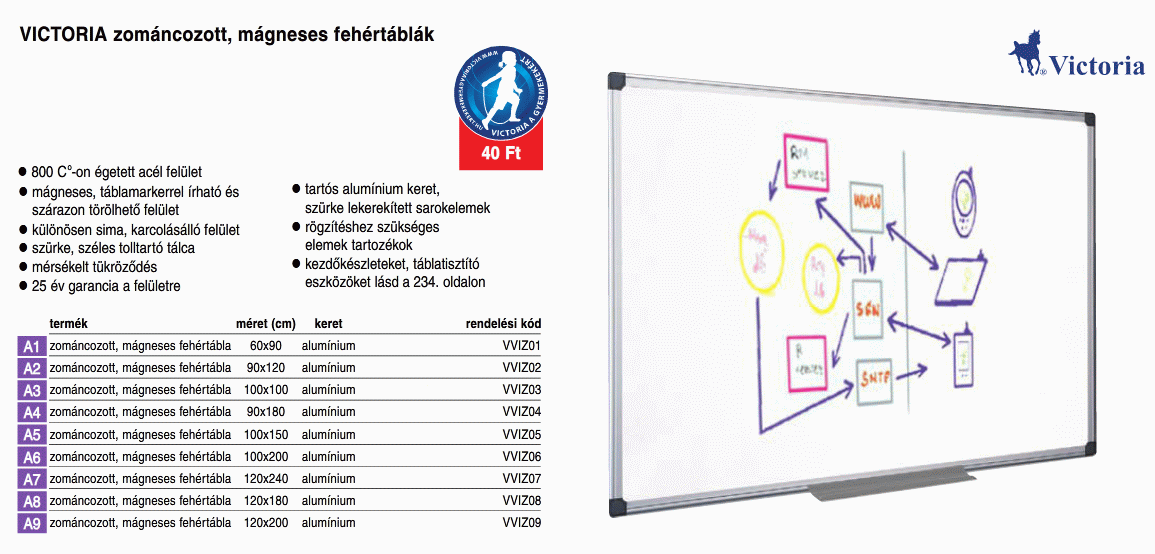 Zománcozott mágneses törölhető fehér tábla alumínium keretes Victoria /garancia 25 év/ | Akció | Nettó ár | Bruttó ár | |||