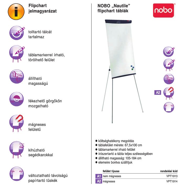 Flipchart tábla | VPT1914 | Flipchart tábla mágneses törölhető 67,5 x 100 cm Nobo Nautile | 24 900 Ft | 31 623 Ft | ||